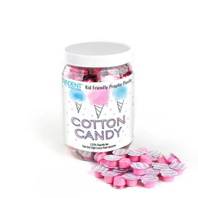 Delicious Cotton Candy flavored Splatter-free Prophy Paste for kids. Fluoride ion concentration of 1.23%